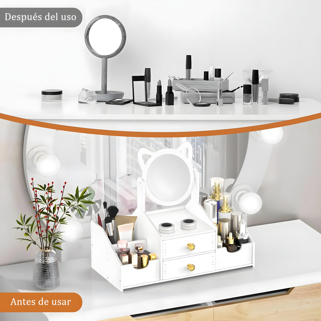 Descubre la solución perfecta para mantener tus productos de belleza impecablemente ordenados y siempre a mano con nuestro multifuncional tocador organizador de cosméticos. Este innovador accesorio combina un amplio espacio de almacenamiento con un práctico espejo integrado y un cajón funcional, transformando cualquier superficie en tu propio rincón de belleza. Ideal para tu tocador, escritorio o baño, su diseño compacto maximiza el espacio sin sacrificar la capacidad.